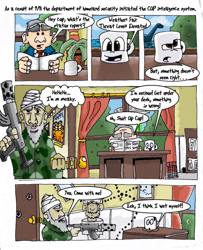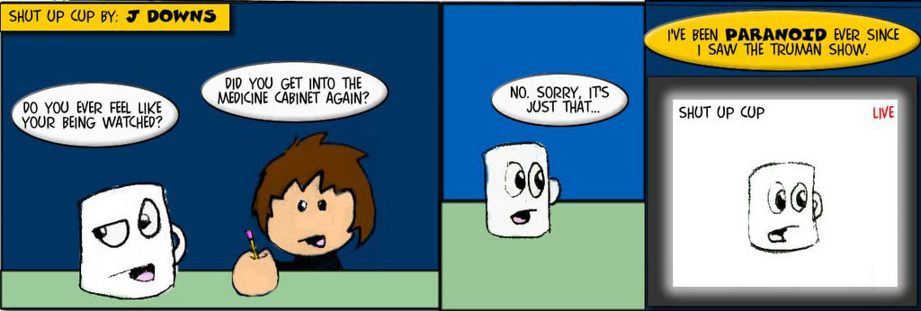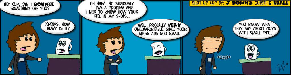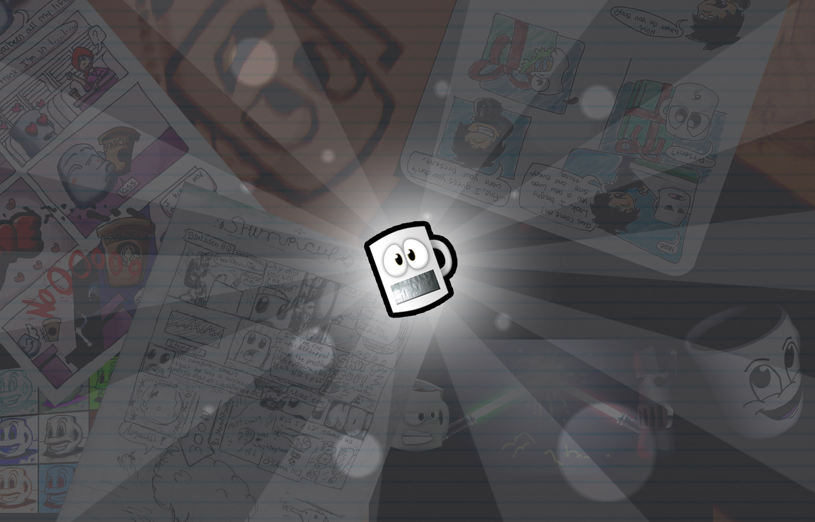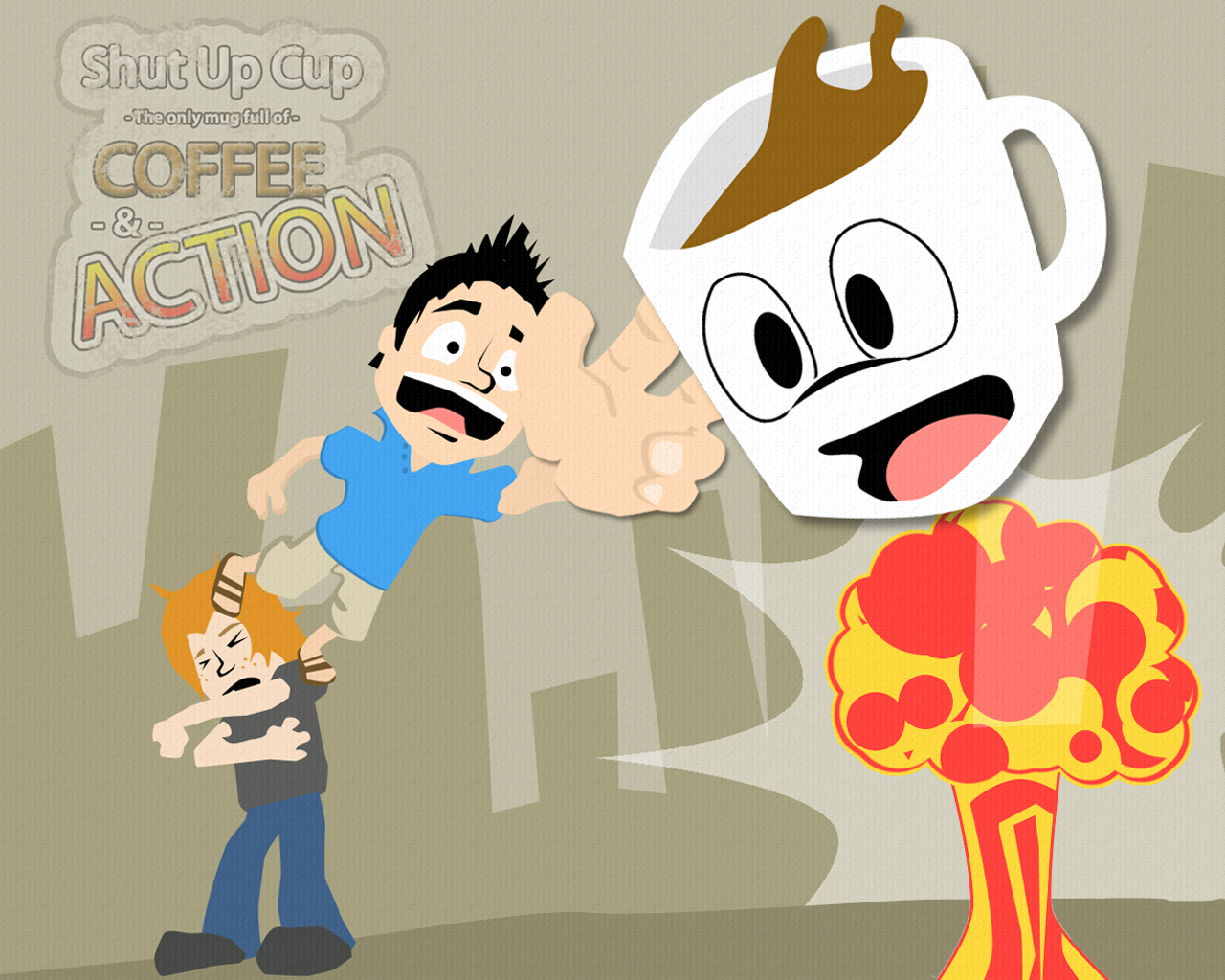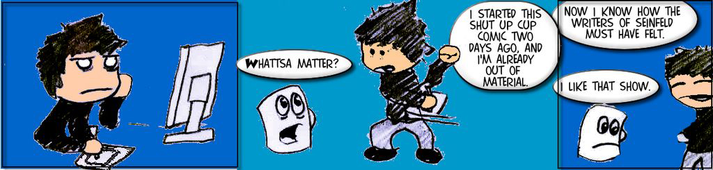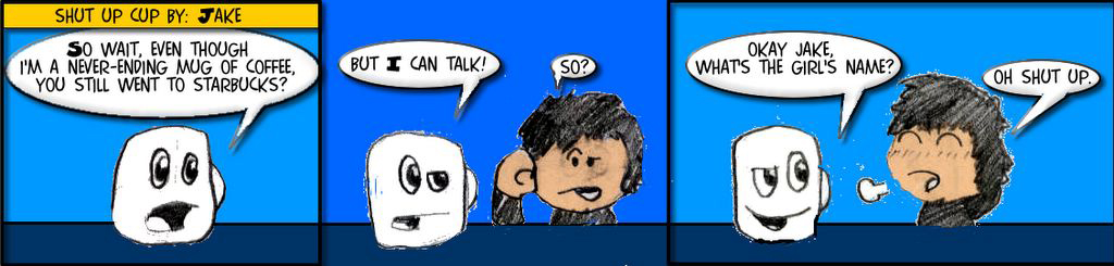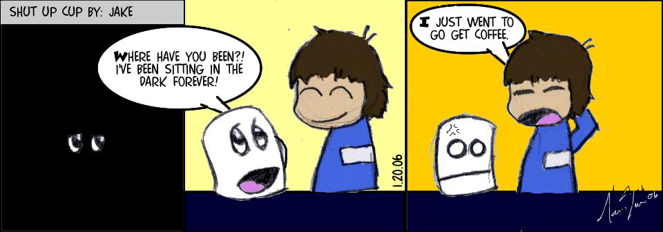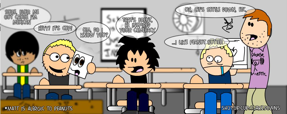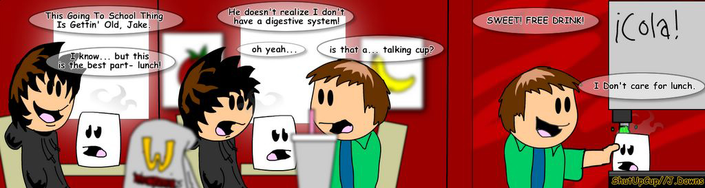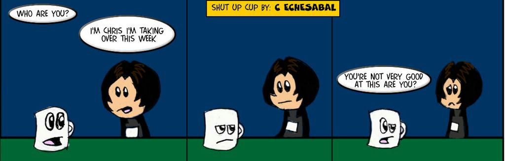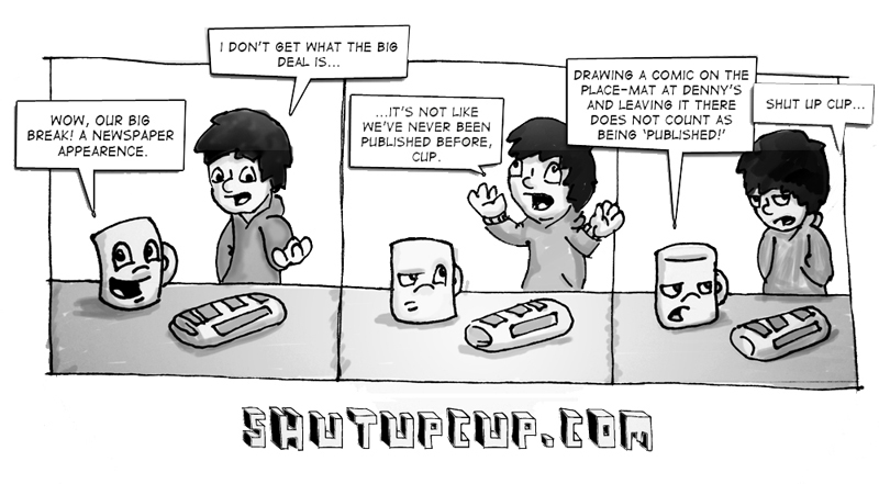 Heh, well- cup was originally created by Sean Cowburn & Jake Downs in the 6th grade. As the story goes, while they were attending Delaware Christian School, their music teacher, Mr. Shirley, had a 'singing' musical cup which would play a song whenever someone picked up. So- every time the teacher would go to take a drink the thing would play its song, and students would yell, Shut up, cup! Sean then expanded the idea, writing short stories which he'd give to Jake to draw, about a cup designed by the U.S. government to stop world disasters, but leaders always neglected him. Brushing him off with the signature catch-phrase in the last cell of each comic. Sean & Jake made a full comic book and everyone enjoyed it. Well, that is until one day when a fellow (jealous) classmate ripped it to shreds.