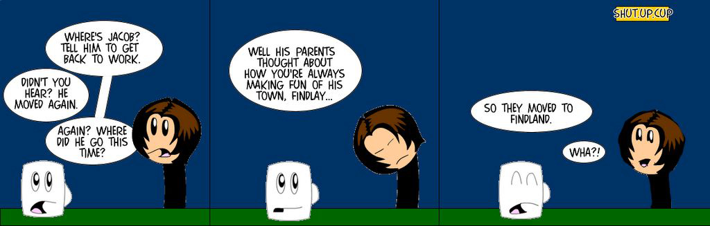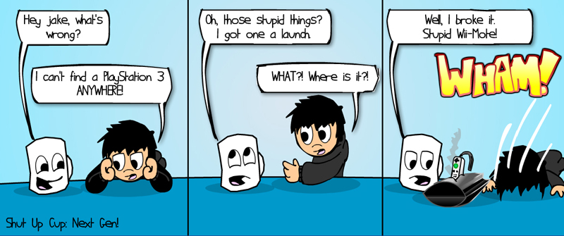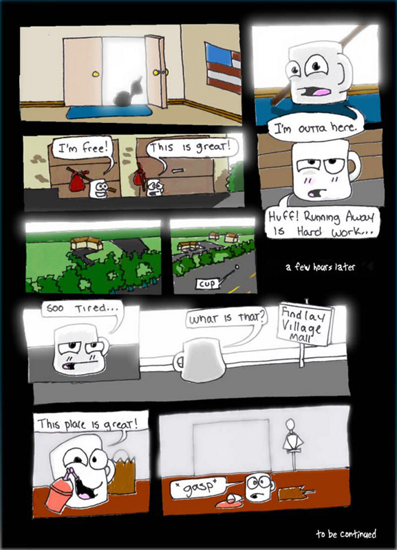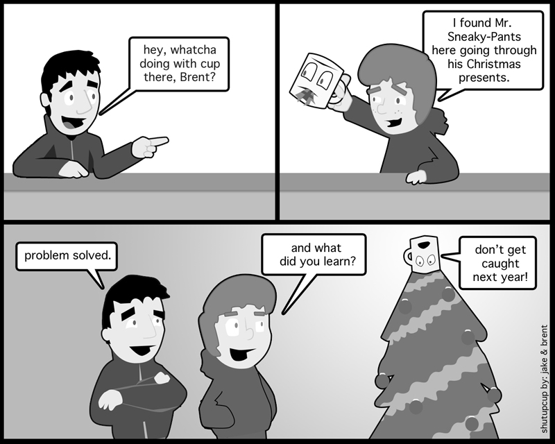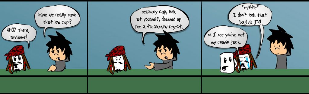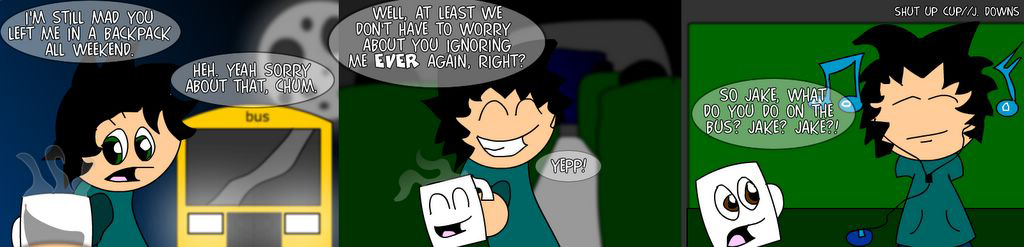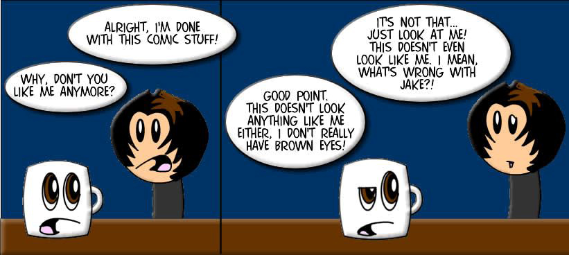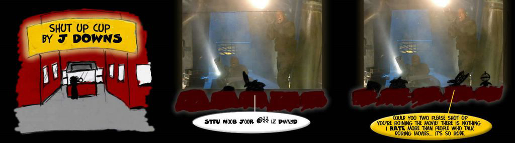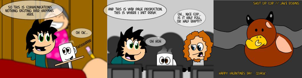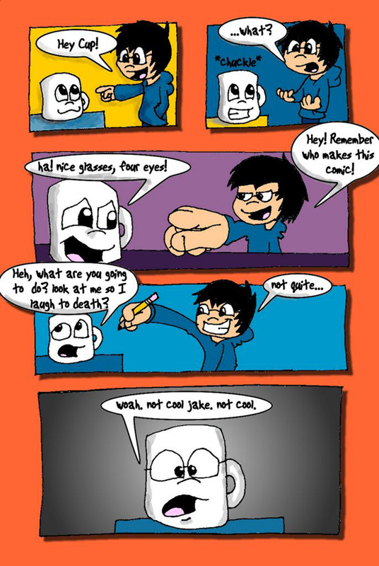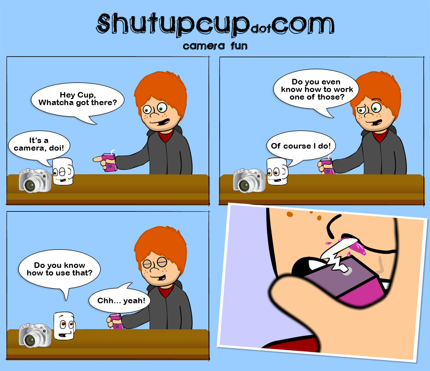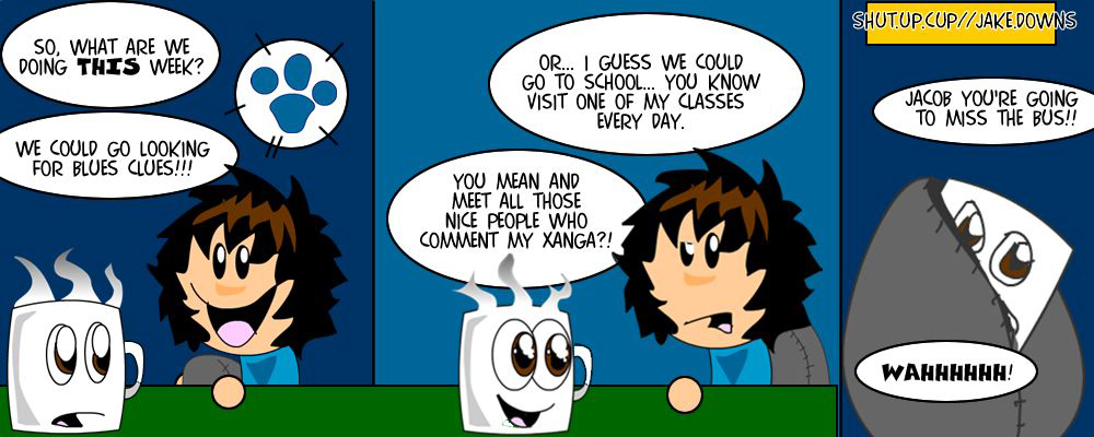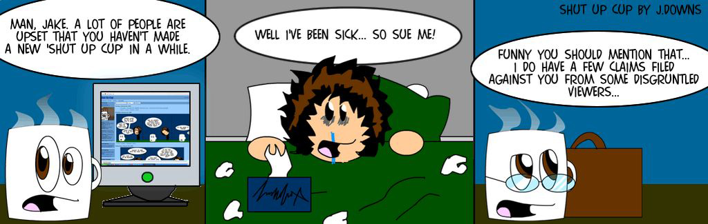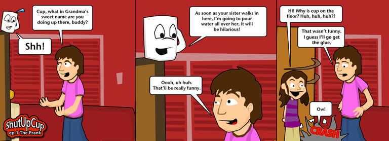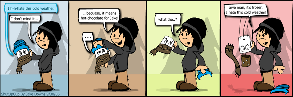 Heh, well- cup was originally created by Sean Cowburn & Jake Downs in the 6th grade. As the story goes, while they were attending Delaware Christian School, their music teacher, Mr. Shirley, had a 'singing' musical cup which would play a song whenever someone picked up. So- every time the teacher would go to take a drink the thing would play its song, and students would yell, Shut up, cup! Sean then expanded the idea, writing short stories which he'd give to Jake to draw, about a cup designed by the U.S. government to stop world disasters, but leaders always neglected him. Brushing him off with the signature catch-phrase in the last cell of each comic. Sean & Jake made a full comic book and everyone enjoyed it. Well, that is until one day when a fellow (jealous) classmate ripped it to shreds.