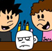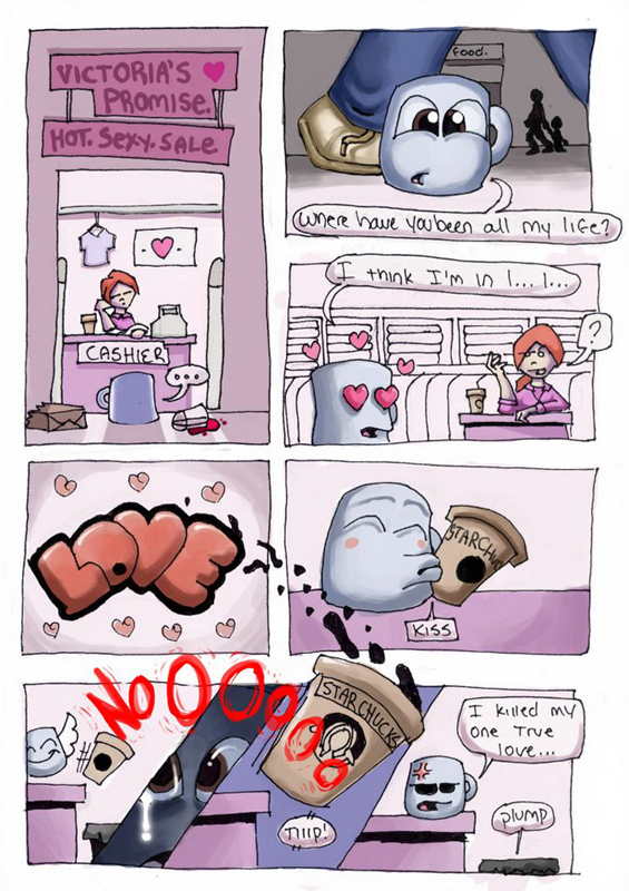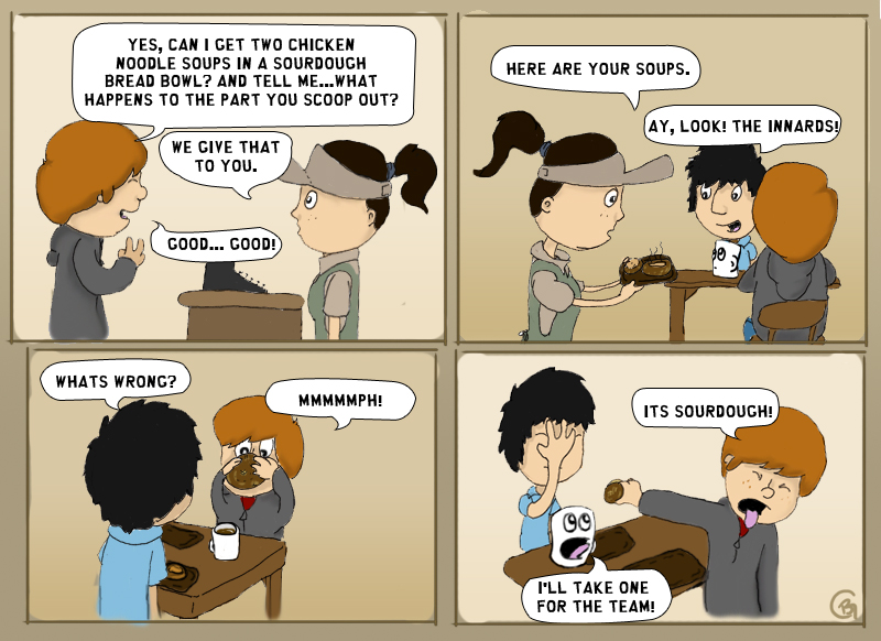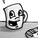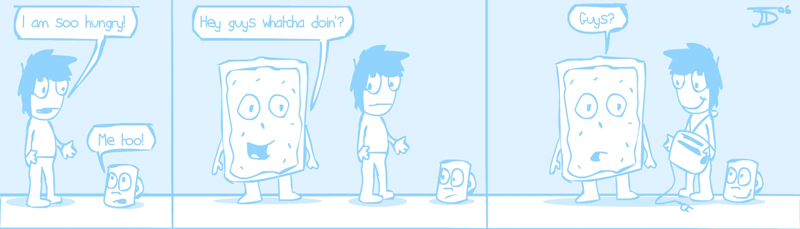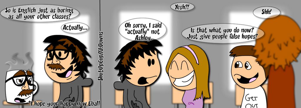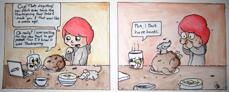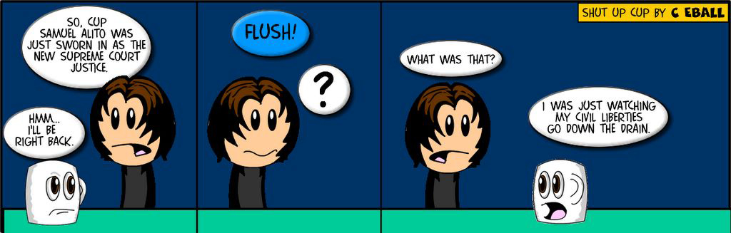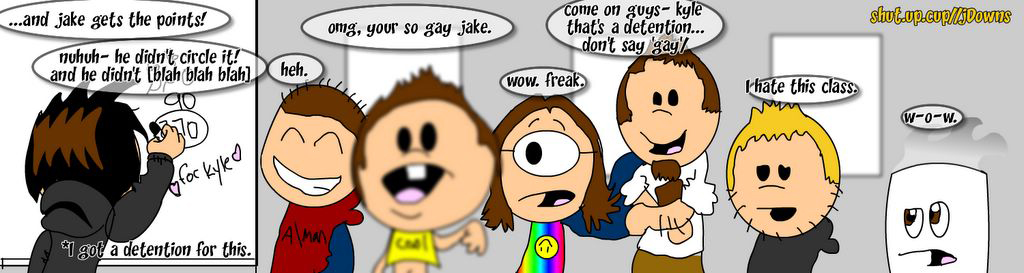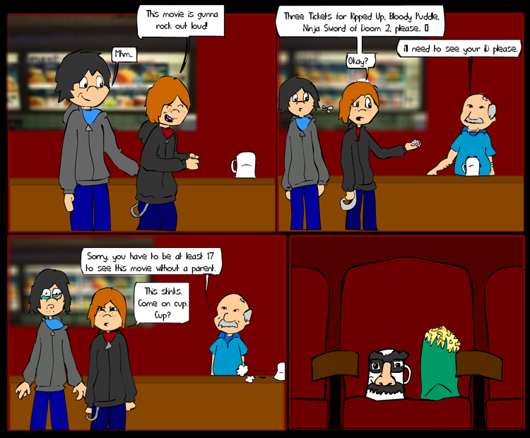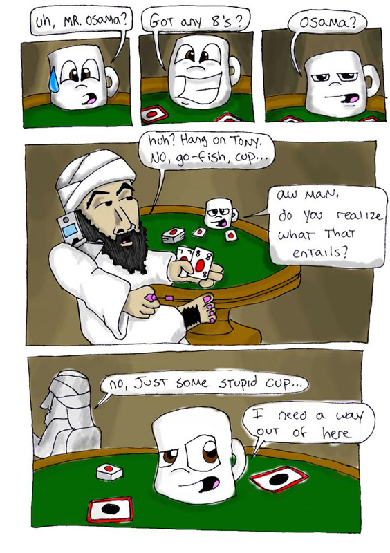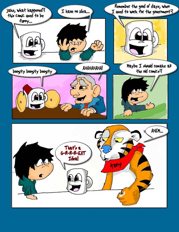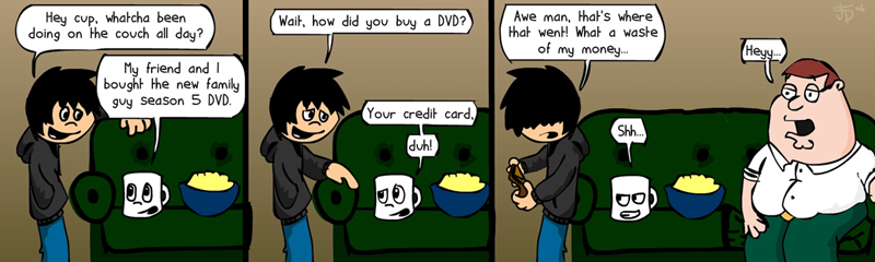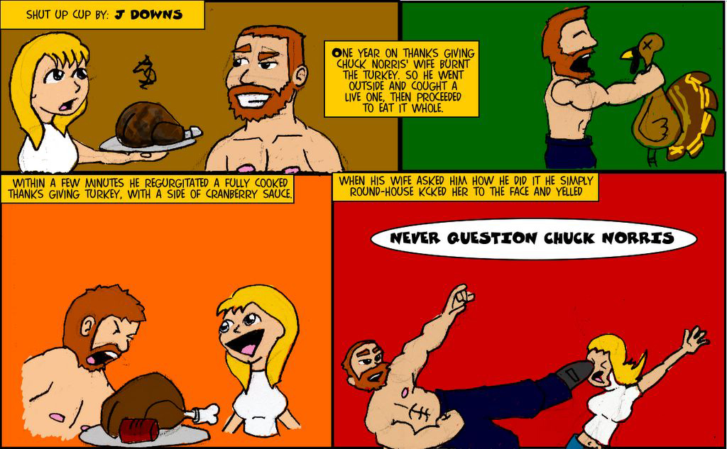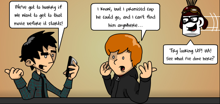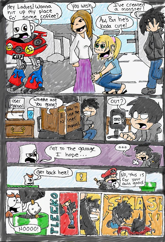 Heh, well- cup was originally created by Sean Cowburn & Jake Downs in the 6th grade. As the story goes, while they were attending Delaware Christian School, their music teacher, Mr. Shirley, had a 'singing' musical cup which would play a song whenever someone picked up. So- every time the teacher would go to take a drink the thing would play its song, and students would yell, Shut up, cup! Sean then expanded the idea, writing short stories which he'd give to Jake to draw, about a cup designed by the U.S. government to stop world disasters, but leaders always neglected him. Brushing him off with the signature catch-phrase in the last cell of each comic. Sean & Jake made a full comic book and everyone enjoyed it. Well, that is until one day when a fellow (jealous) classmate ripped it to shreds.