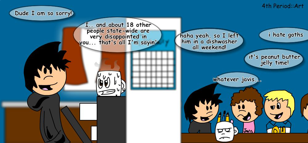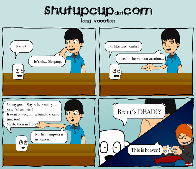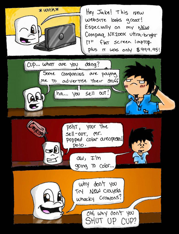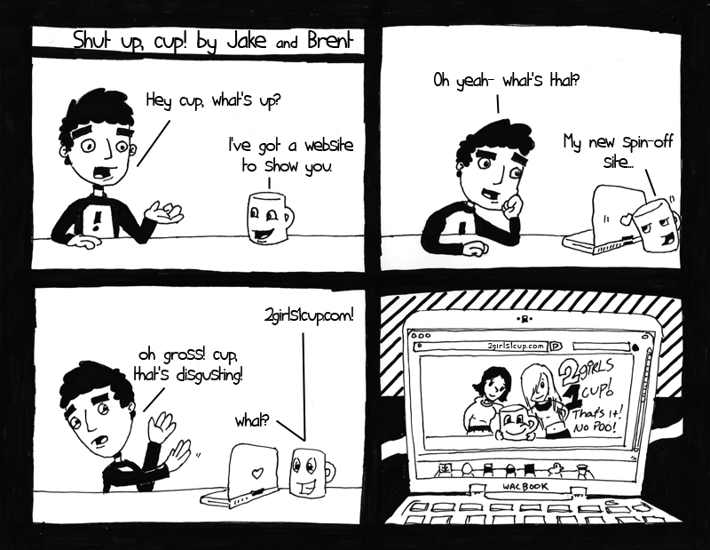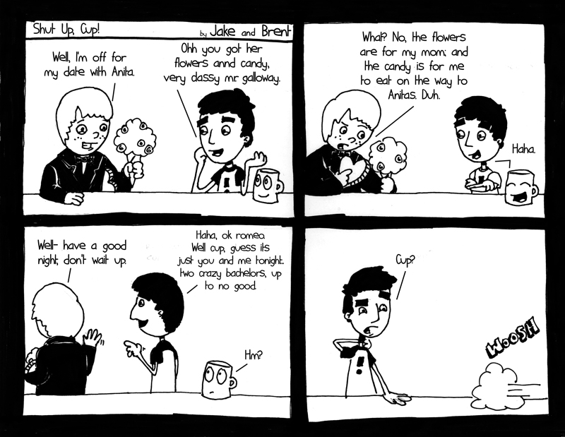 Well, shutupcup.com is a collaborative effort between two high school seniors, Brent Galloway & Jake Downs. It is a semi-annually updated webcomic starring Jake, Brent, their friends and family- and of course, a very special character named, cup. It is also a portfolio-type site for the boys to showcase their creative talents.